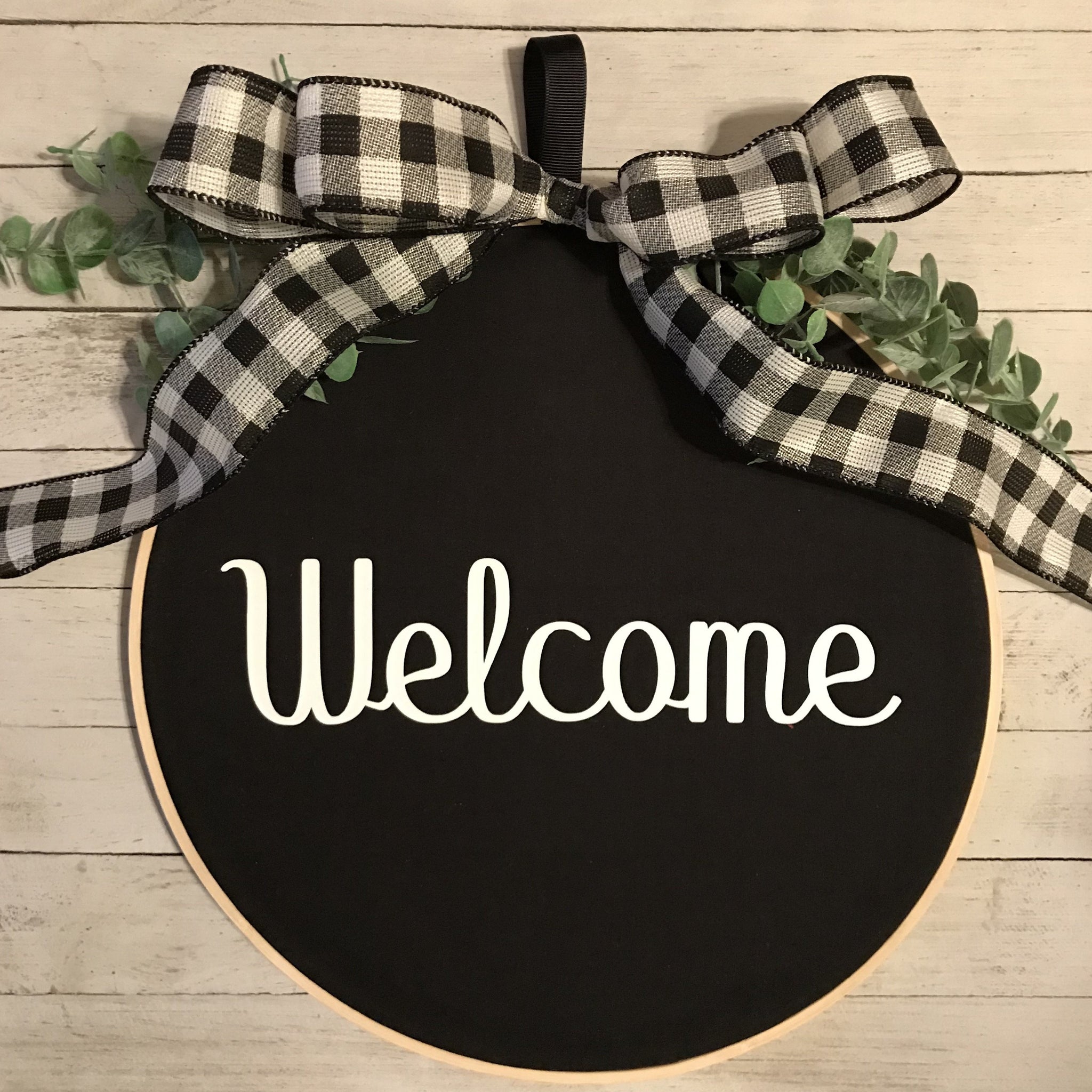 The wreath is made from an embroidery hoop and fabric with decorative ribbon and artificial greens. The design is white and applied using HTV.